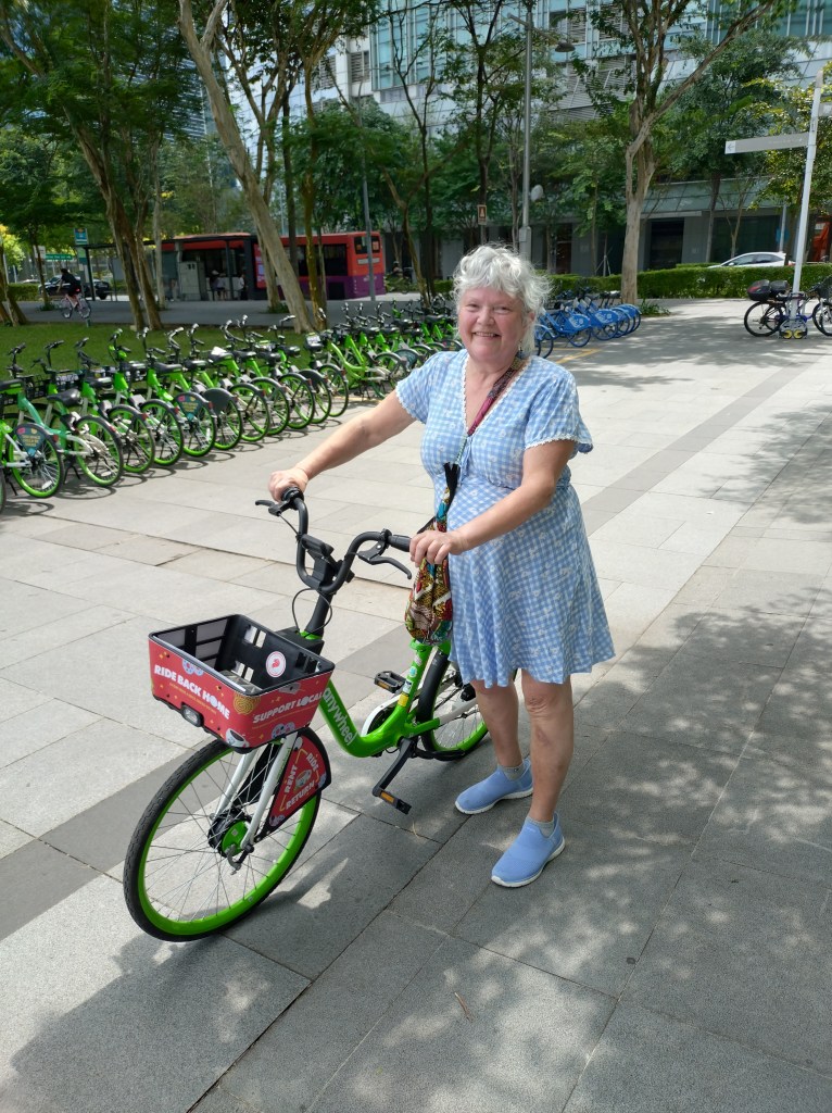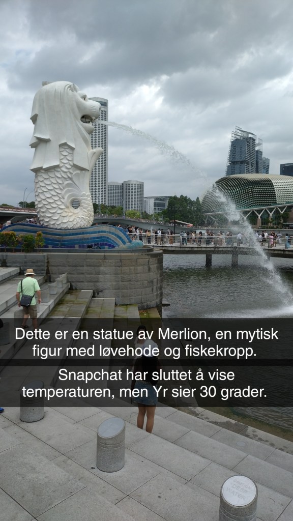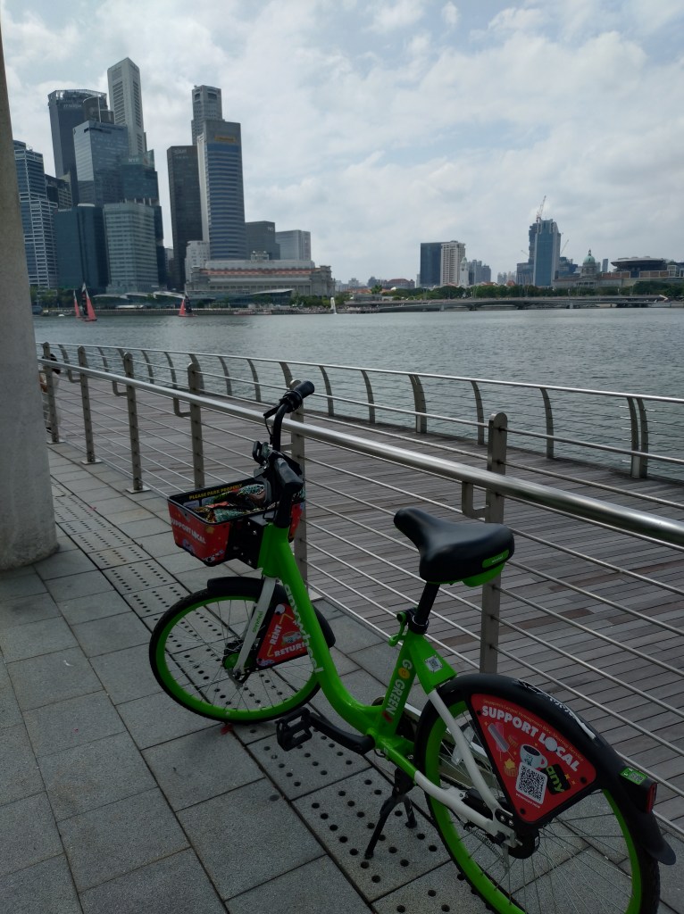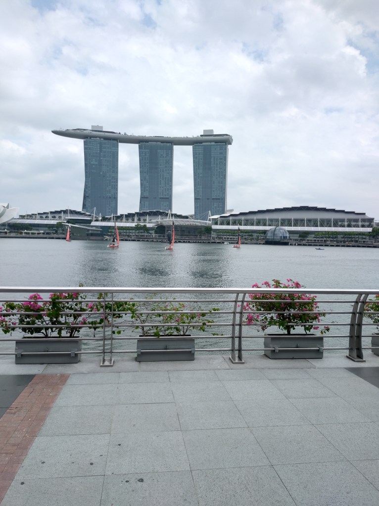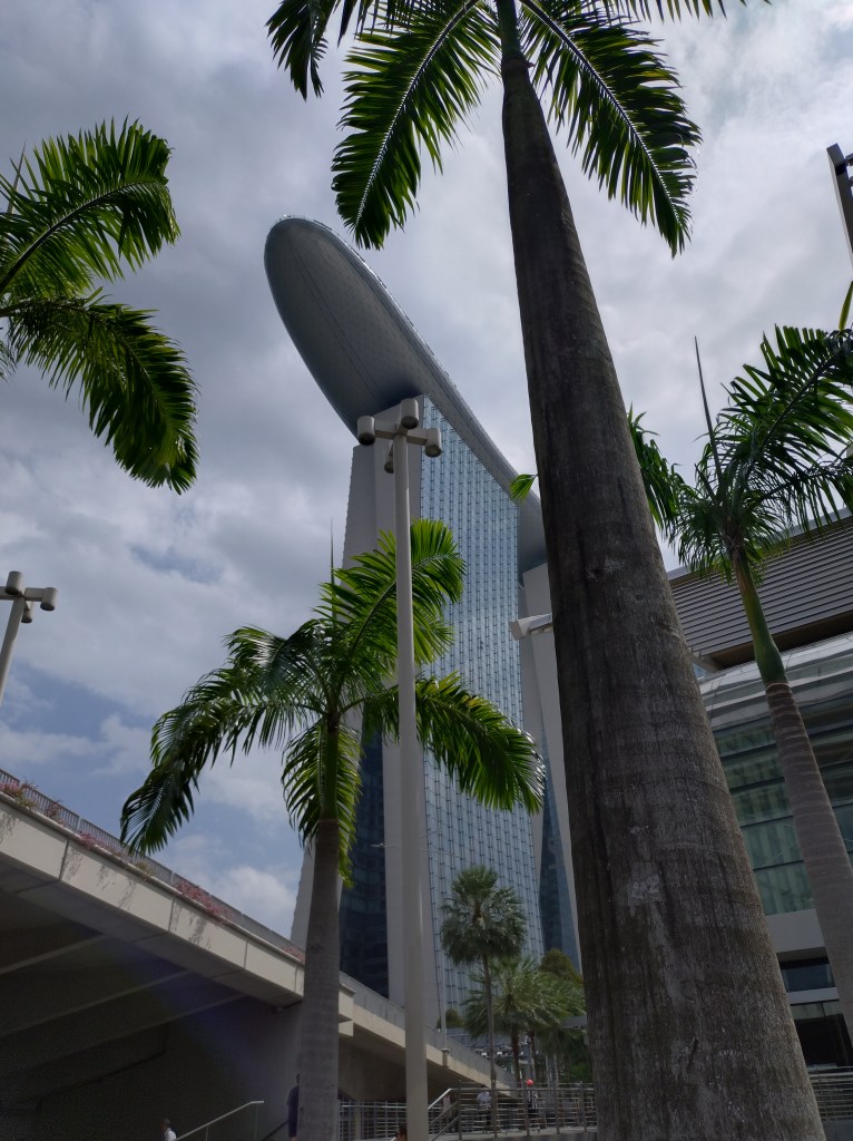 Det var forresten en fantastisk opplevelse å sykle i havneområdet ved Gardens by the Bay. Flotte gang og sykkelstier flere kilometer langs sjøen, og nydelig busker, trær og blomster. Jeg syklet i 2 og en halv time, og etterpå måtte jeg unne meg middag på en fin restaurant som lå i underetasjen på et av byens beste hotell «Marina Bay Sands». Det er det hotellet som ser ut som det har en båt liggende oppå toppen av tre blokker. Jeg ser det fra hotellvinduet mitt. Det er stilig.