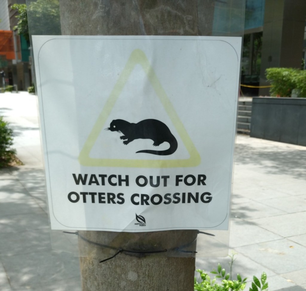 I dag har jeg vært på sykkeltur i Singapore i 30 varmegrader. Dette skiltet kunne vært en aprilspøk i januar, men faktum er at det lever mye oter i denne byen og myndighetene legger vekt på å beskytte disse dyrene når de flytter seg fra en vannvei til en annen. Har sett videoer der politiet stopper trafikken slik at oterne kommer trygt over. Det er bare å søke på You Tube. (Otters in Singapore)
