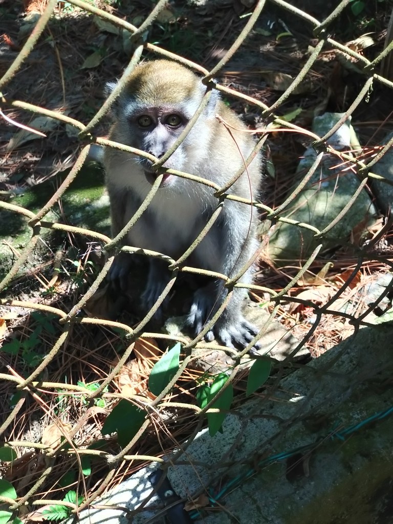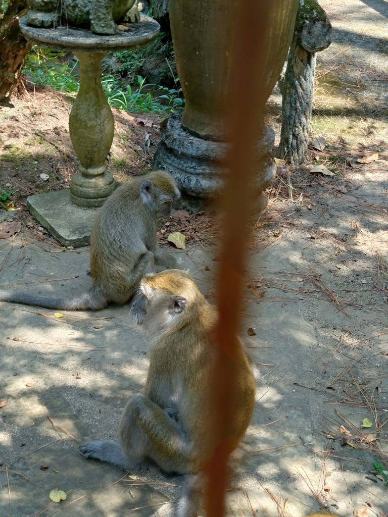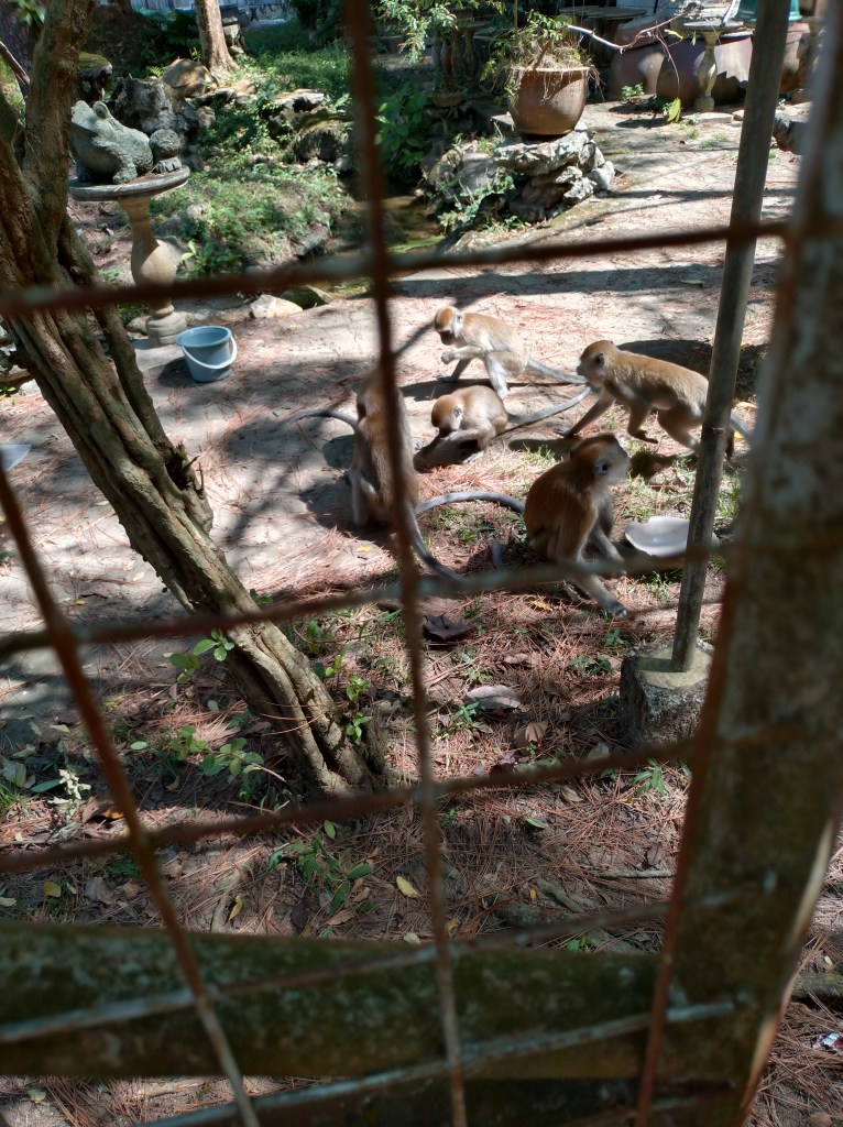 Det besto av flere bygninger. Først måtte vi passere en gjeng med apekatter som så ut til å være sperret inne bak et gjerde, men som klatret over gjerdet så lett som ingenting. Men det så ut som de fikk mat og drikke bak gjerdet, så derfor vendte de vel tilbake dit.
