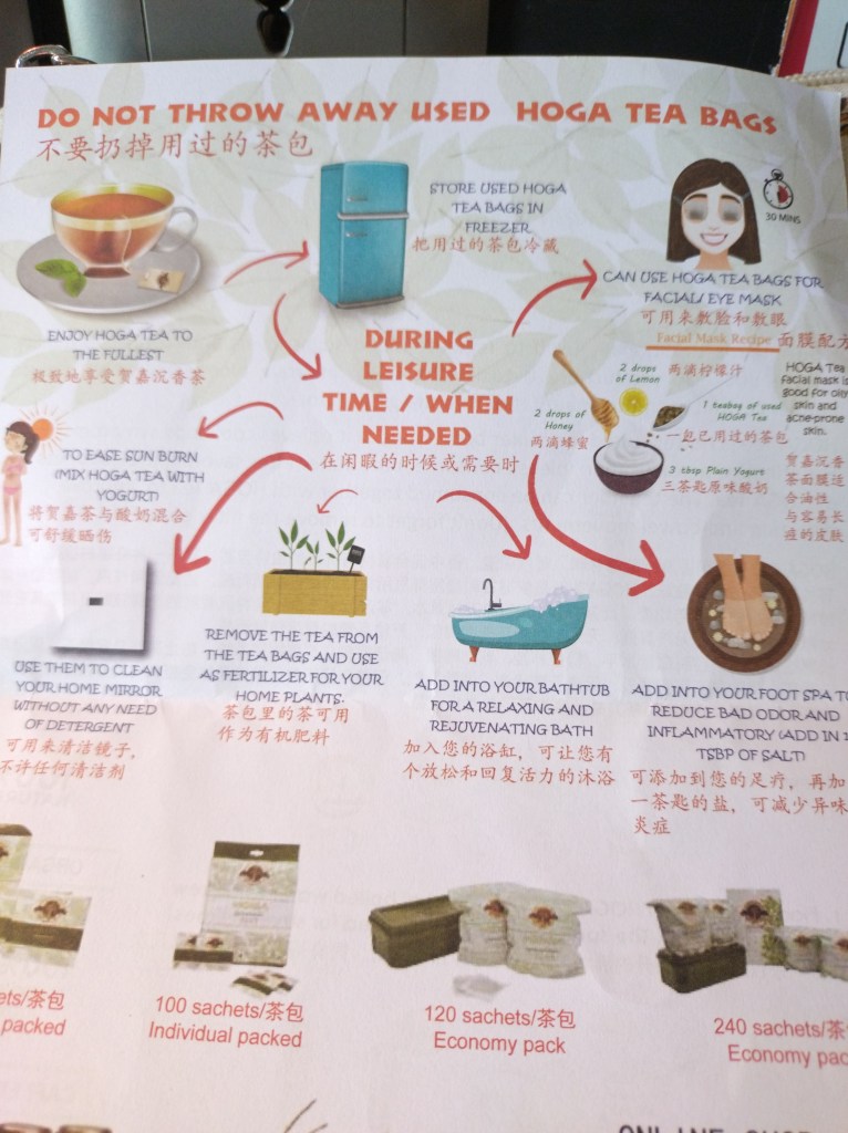 Man oppfordres til å ta vare på trefibrene i teposen etter bruk, spise dem, bruke dem som plantegjødsel, som ansiktsmaske eller tilsette i badevannet.