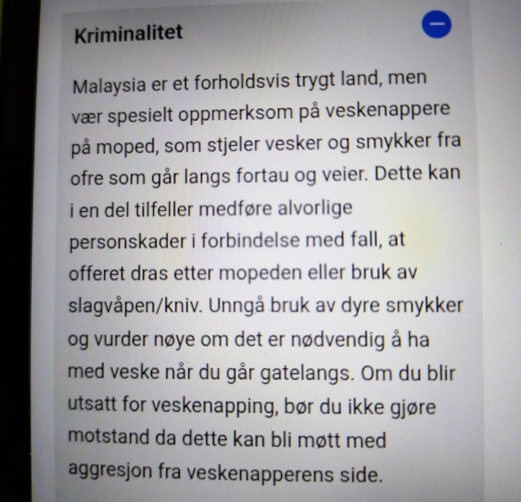 Poenget er imidlertid at veskenappere spesielt i Kuala Lumpur kommer kjørende på moped. Hvis de når tak i veska di, slipper de ikke og du kan bli dratt etter og påført store skader. Utenriksdepartementet nevner også dette i sine reiseråd for Malaysia.